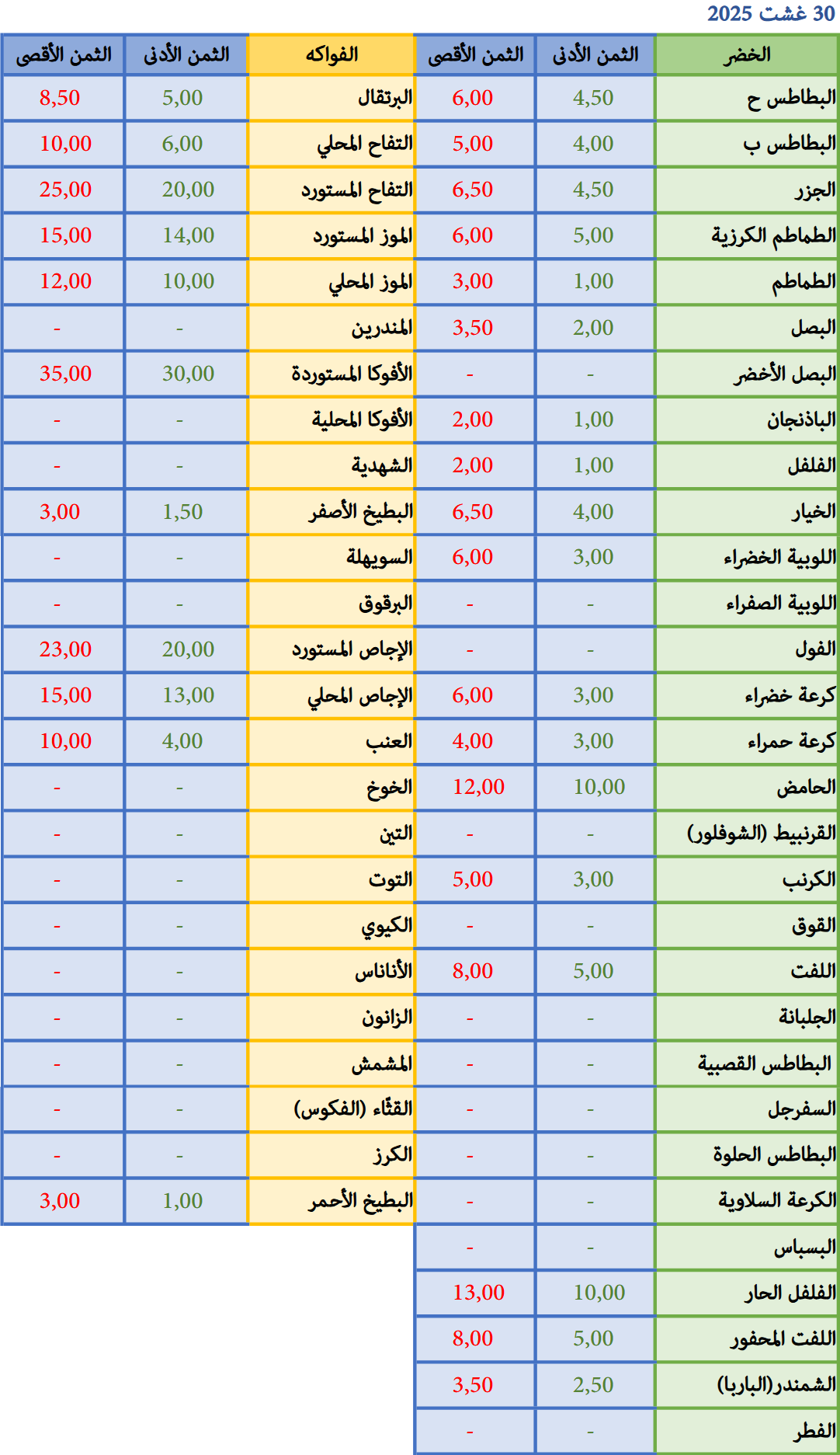2025ينايرأثمنة سوق الجملة للخضر والفواكه لشهر يناير- تصفح لائحة 30 يناير