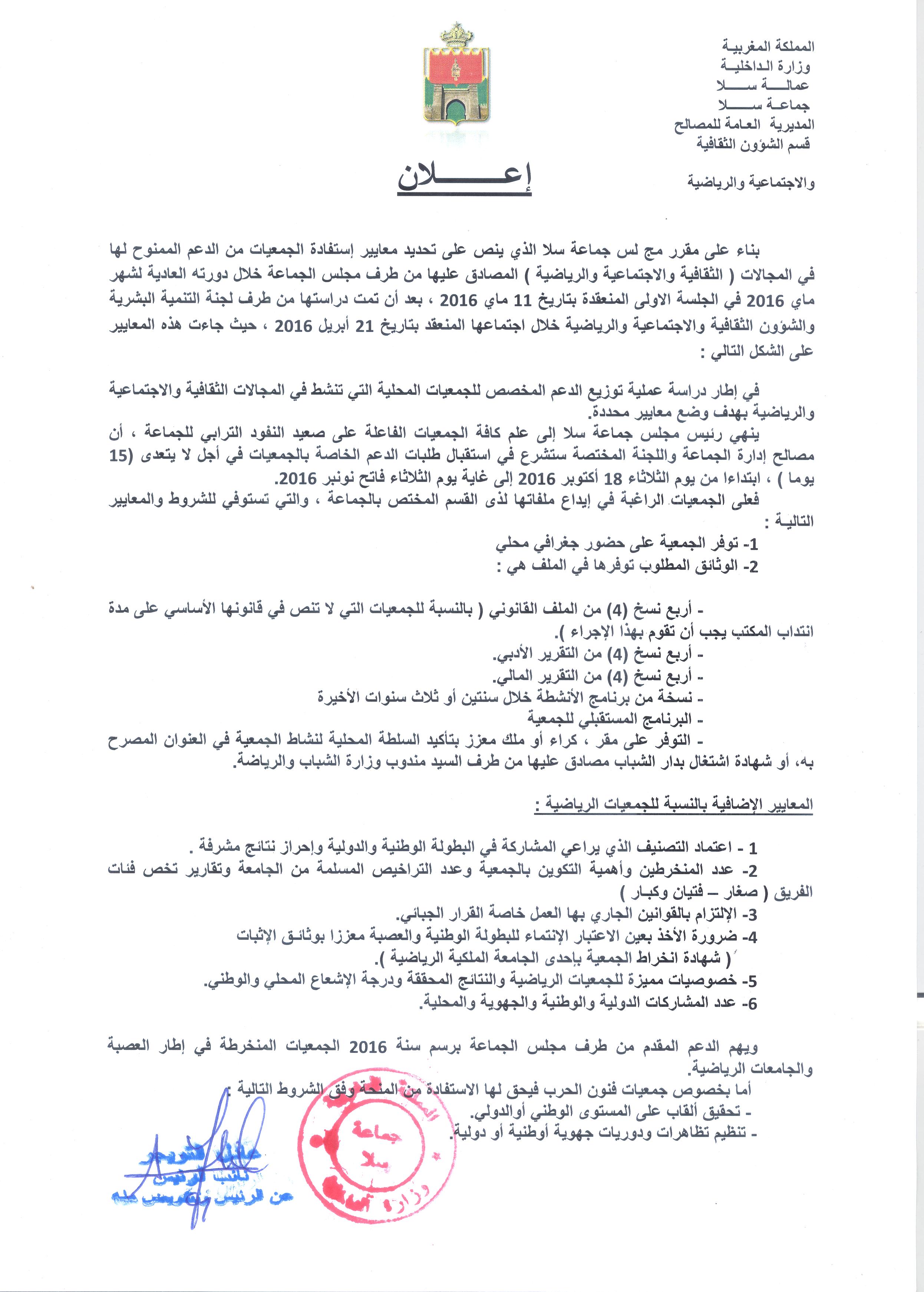 ينهي رئيس جماعة سلا إلى علم كافة الجمعيات الفاعلة على صعيد النفوذ الترابي للجماعة، أن مصالح إدارة الجماعة و اللجنة المختصة ستشرع في استقبال طلبات الدعم الخاصة بالجمعيات في أجل لا يتعدى 15 يوما ، ابتداء من يوم الثلاثاء 18 اكتوبر إلى غاية يوم الثلاثاء فاتح نونبر 2016.